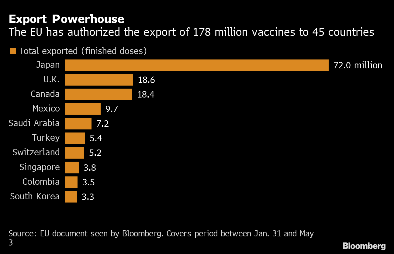 The EU has authorized the export of 178 million vaccines to 45 countries