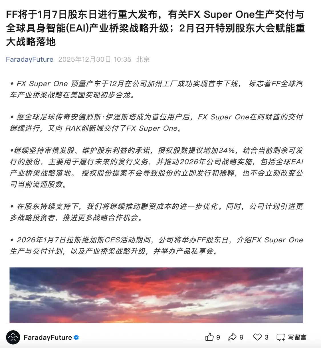 公司更名提案方面,寻求股东批准对公司章程的修订,将公司名称从Faraday Future Intelligent Electric变更为Faraday Future AI Electric Vehicle Inc.