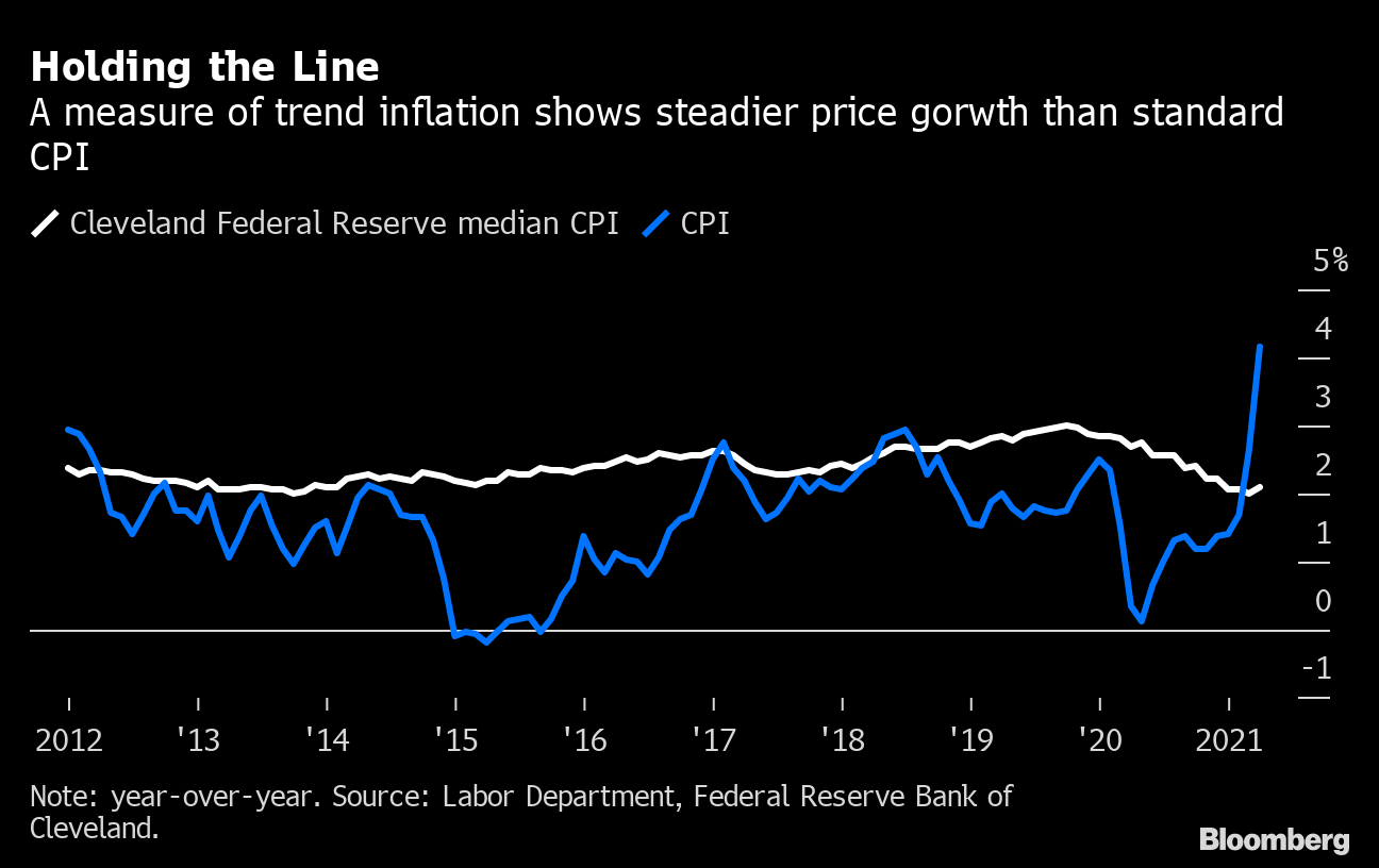 Big price increases, as seen in April CPI reading, which was the highest since 2009, are mostly due to pent-up spending as the economy reopens more broadly and factors like supply-chain bottlenecks, Fed officials have argued. Measures of trend inflation, including the Cleveland Fed’s median CPI gauge, at 2.1% in April, are still in check.