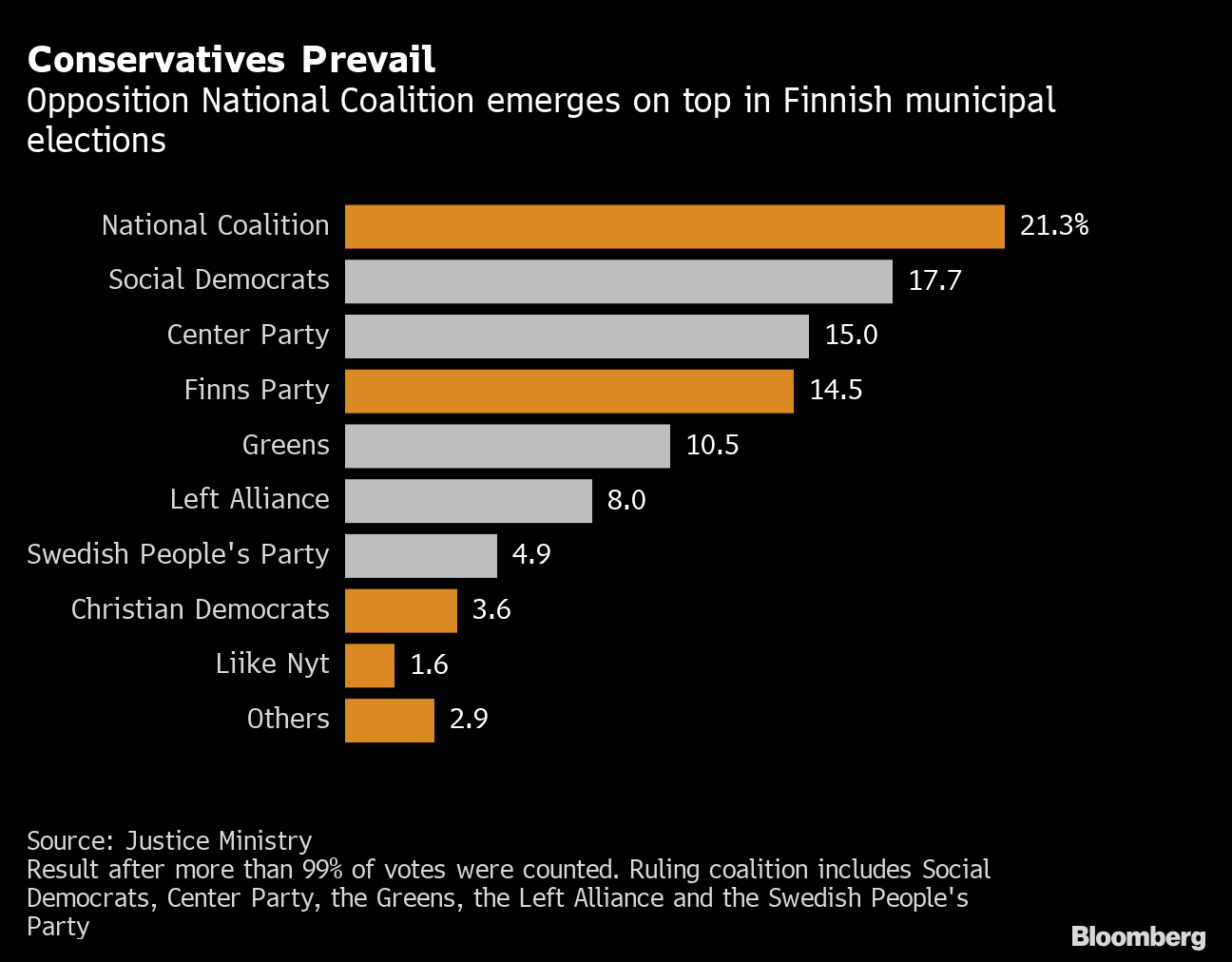 The opposition party garnered 21.3% of the vote, more than it had in the previous municipal vote four years ago. Prime Minister Sanna Marin’s Social Democrats were second ahead of Finance Minister Annika Saarikko’s Center Party after more than 99% of ballots were counted.