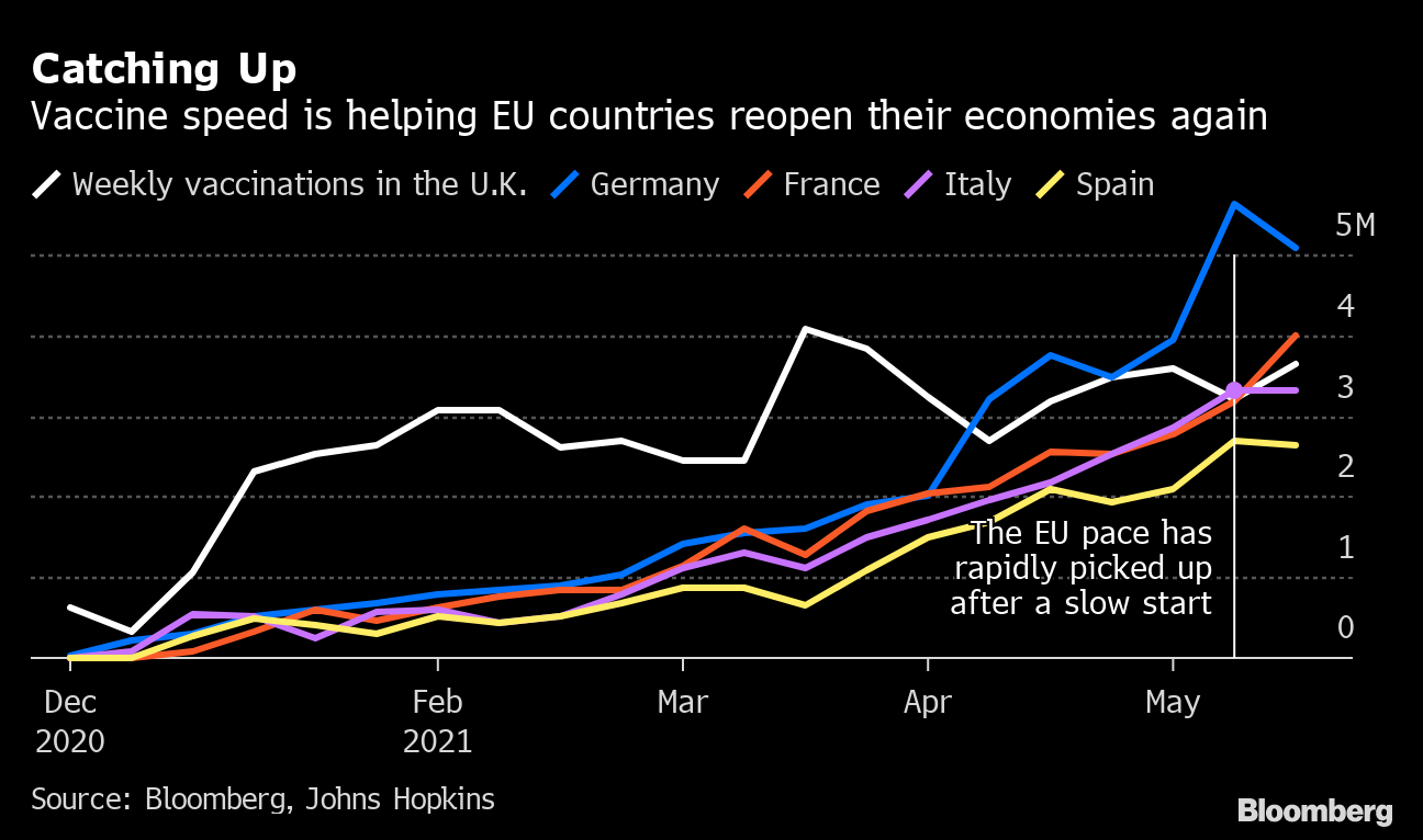 There’s a lot at stake. After a sluggish start to vaccination campaigns, Europe’s reopening is trailing the U.K. and the U.S., and the region can ill afford to fall further behind. The European Commission last week upgraded its 2021 growth outlook for the euro area to 4.3% after taking account of the bloc’s 800 billion-euro ($975 billion) joint recovery fund for the first time. But that pace would still fall short of the rebounds of at least 6% that economists expect to see in the U.S. and the U.K.