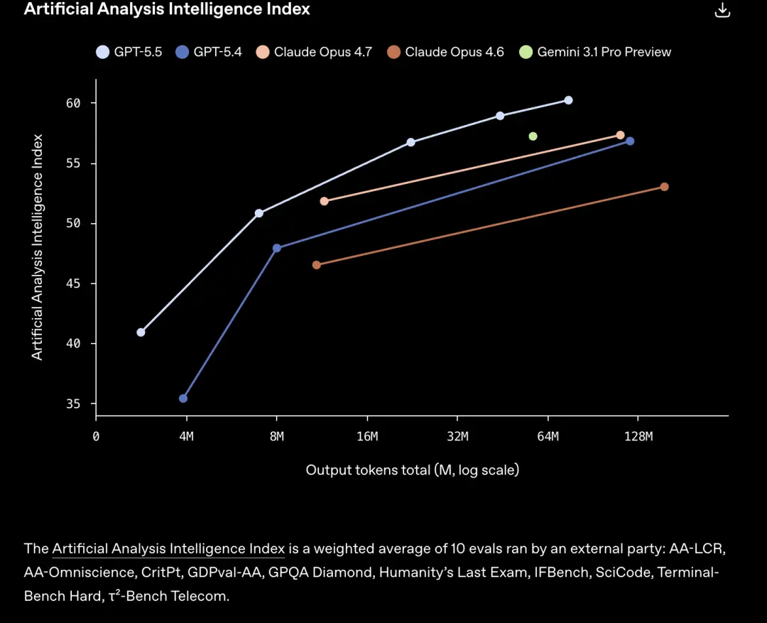 GPT-5.5获得相同的分数比Claude Opus 4.7和其他模型消耗token更少。