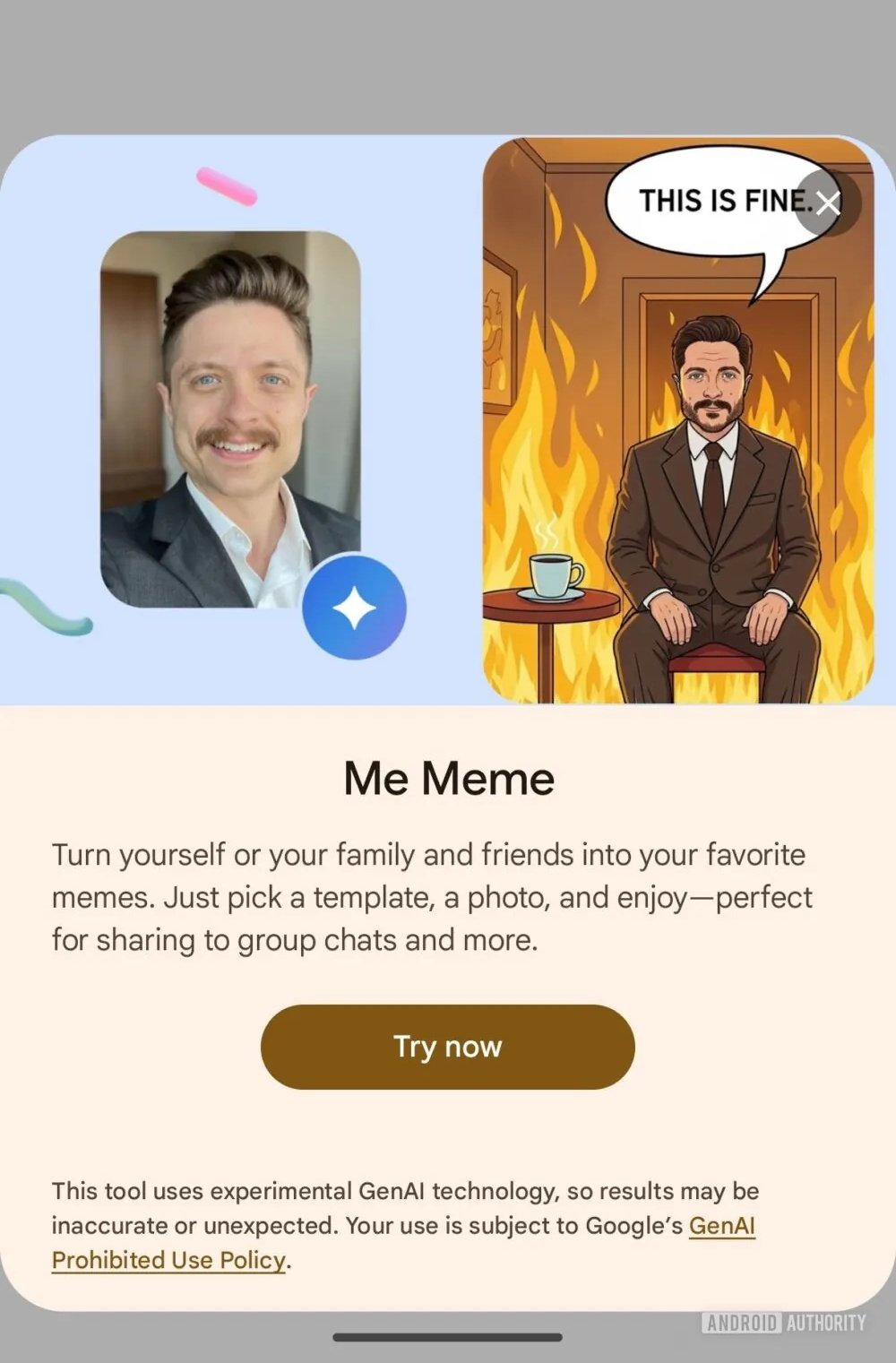 据介绍,“Me Meme”允许用户选择一张模版图,再搭配一张含有自己形象的照片,由Google的 Gemini AI 技术(具体为 Nano Banana 模型)生成合成后的表情包图片。Google方面同时提醒,这是一项实验性功能,生成结果“可能无法完全匹配原始照片”,并建议用户使用光线良好、对焦清晰、正脸朝向的照片,以获得更佳效果。