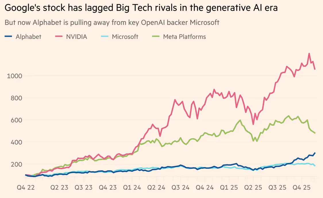 就在一年前,许多人还曾认为,Google为缩小OpenAI巨大领先优势而付出的努力注定失败。在2023年至2024年由AI推动的股市上涨行情中,由于市场担忧Google的摇钱树搜索引擎会被ChatGPT及Perplexity等新型AI搜索应用侵蚀,其母公司Alphabet的股价一直远远落后于其他科技巨头。