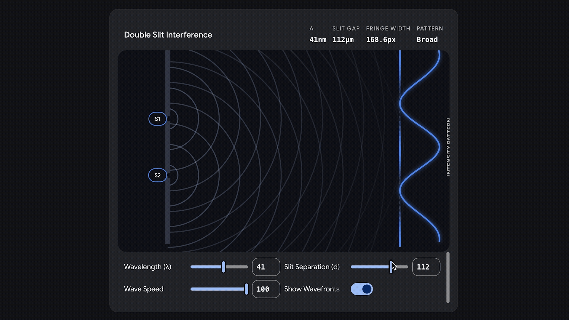 类似地,在量子物理领域,用户可以通过“Show me how a double slit experiment works(给我演示双缝实验如何运作)”来探索双缝干涉过程。 Gemini 会提供可交互界面,让用户修改波长、波速、缝距等参数,并在屏幕上实时看到波形和干涉图样随之变化,从而以直观方式理解原本抽象的物理概念。