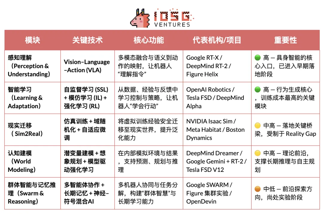 具身智能的核心技术体系可视为一个自下而上的智能栈:VLA(感知融合)、RL/IL/SSL(智能学习)、Sim2Real(现实迁移)、World Model(认知建模)、以及多智能体协作与记忆推理(Swarm & Reasoning)。其中,VLA 与 RL/IL/SSL 是具身智能的“发动机”,决定其落地与商业化;Sim2Real 与 World Model 是连接虚拟训练与现实执行的关键技术;多智能体协作与记忆推理则代表更高层次的群体与元认知演化。