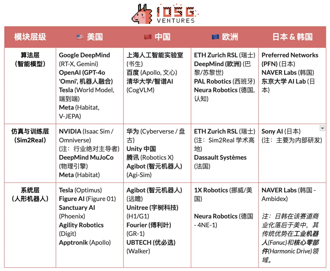 · 中国凭借规模化制造、垂直整合与政策驱动,在零部件、自动化工厂与人形机器人领域形成领先优势,硬件与供应链能力突出,宇树与优必选等已实现量产,正向智能决策层延伸。但在 算法与仿真训练层与美国仍存较大差距。