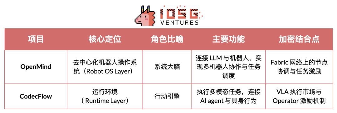 · 模型智能层(Model & Intelligence Layer)是当前最具长期价值的方向。以 OpenMind 为代表的开源机器人操作系统,尝试打破封闭生态、统一多机器人协作与语言到动作接口。其技术愿景清晰、系统完整,但工程量巨大、验证周期长,尚未形成产业级正反馈。