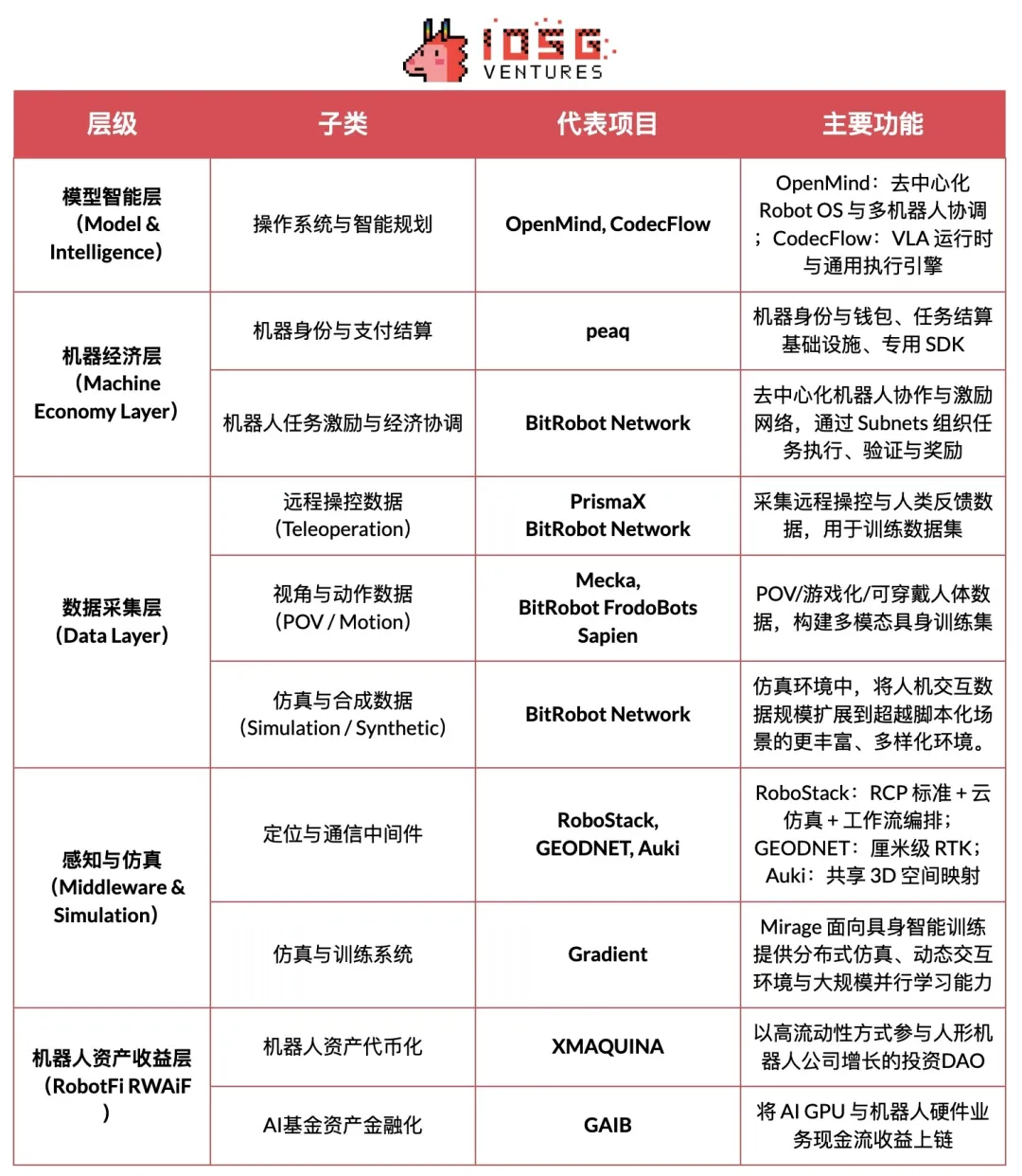 基于“可验证进展、技术公开度、产业相关度”三项标准,梳理当前 Web3 × Robotics 代表性项目,并按五层架构归类:模型智能层、机器经济层、数据采集层、感知与仿真基础层、机器人资产收益层。为保持客观,我们已剔除明显“蹭热点”或资料不足项目;如有疏漏,欢迎指正。