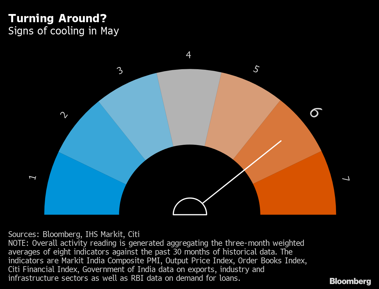 India’s economy showed more signs of cooling in May, but the weakness is already beginning to dissipate of late as the nation exits lockdowns imposed to check the pandemic’s spread.