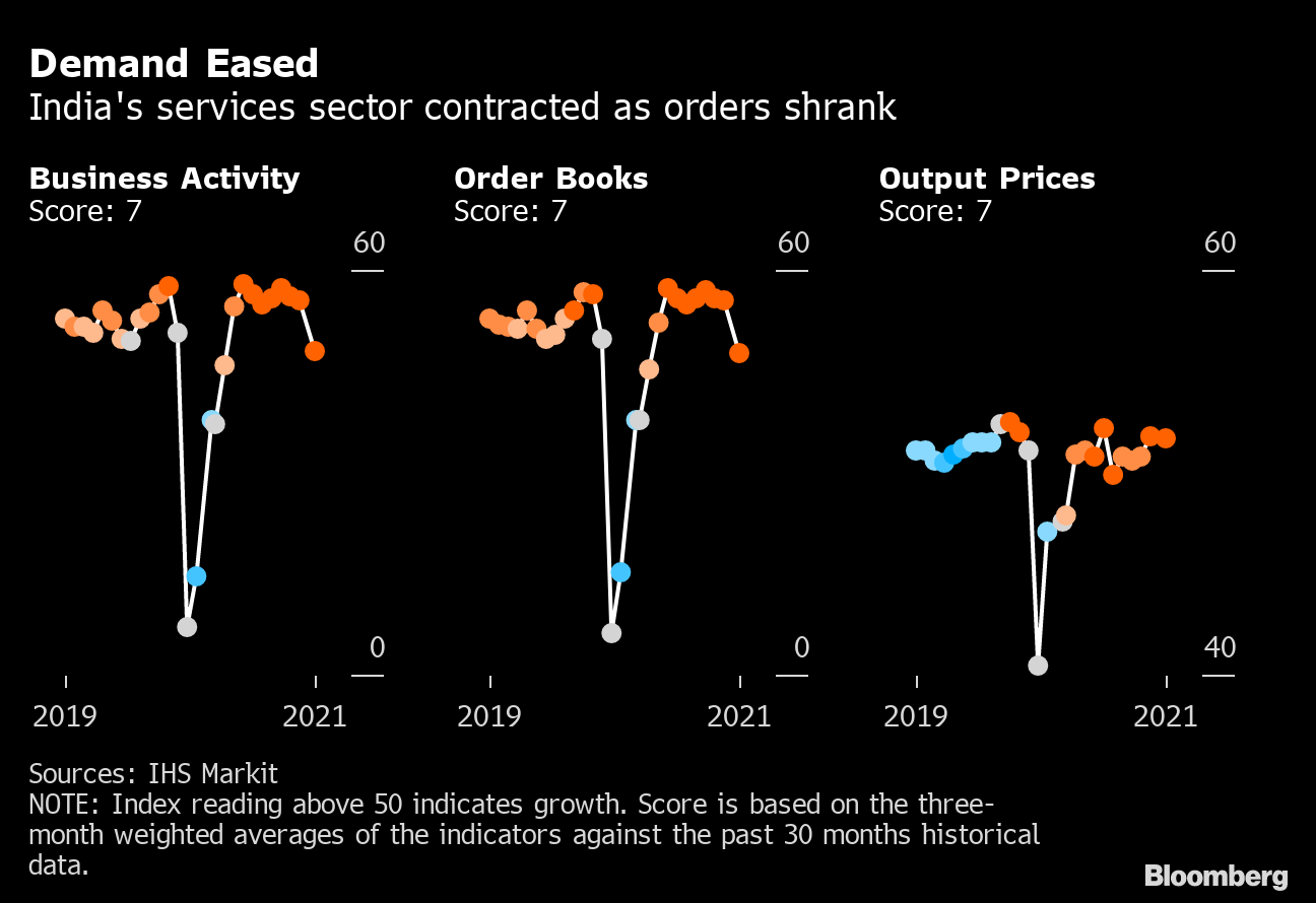 Activity in India’s dominant services sector contracted for the first time in eight months in May. The IHS Markit India Services Purchasing Managers’ Index slid to 46.4 last month from 54 in April, falling below the 50 level that divides contraction from expansion. Services sector accounts for more than half of the nation’s gross domestic product.