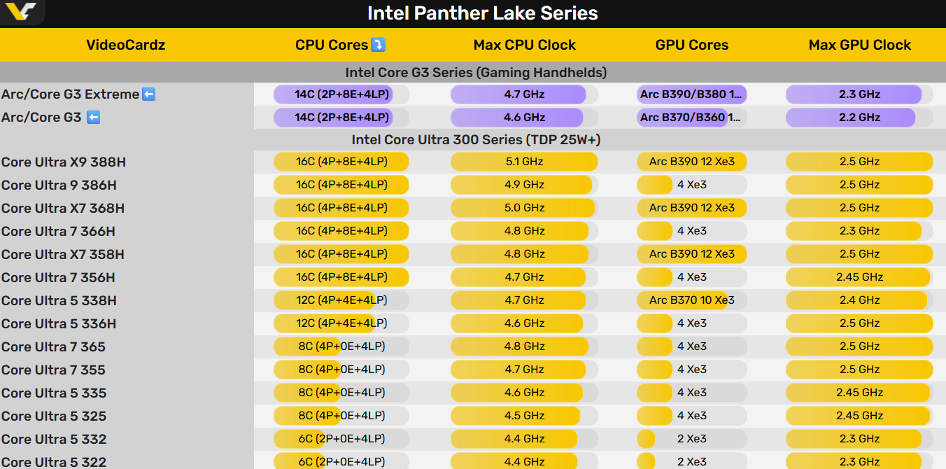 规格方面,锐炫G3系列都是16核心,包括2P、8E、4LPE,这样的规格在酷睿Ultra 300系列中是没有的,是专门为了掌机设备设计的,在4+8+4的基础上阉割了2个P核。