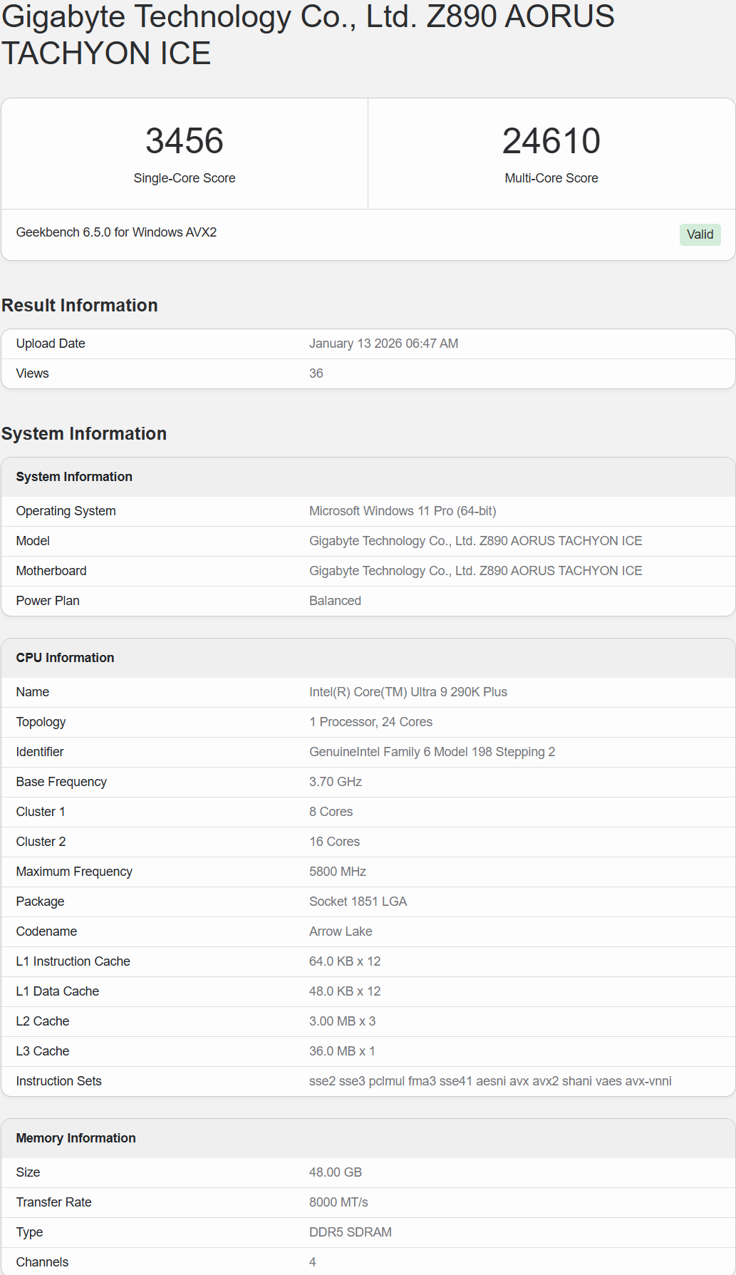性能方面,Intel酷睿Ultra 9 290K PLUS CPU在单线程测试中获得3456分,在多核测试中获得24610分。与酷睿Ultra 9 285K相比,单核性能提升7%,多核性能提升9%。