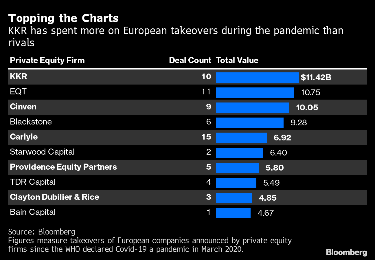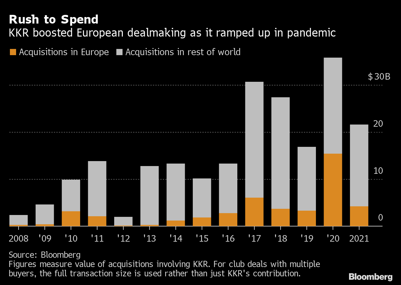 It became a pivotal moment for KKR in Europe, where it previously hadn’t deployed as much money as in other parts of the world. KKR has announced $19.6 billion of deals in the region since the start of the pandemic, from listed company buyouts to minority investments, according to data compiled by Bloomberg. It’s also snapped up assets from other private equity firms, and sometimes swooped in before rivals had a chance to bid.