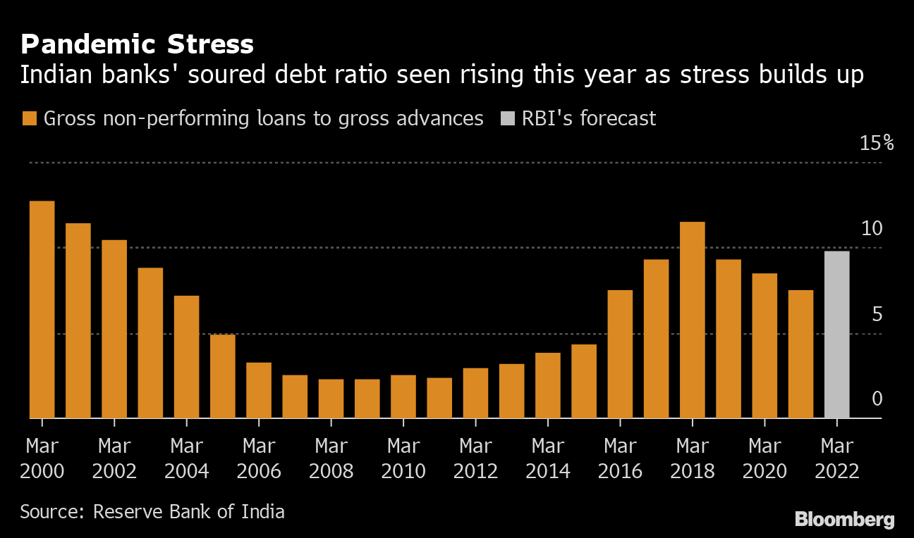 “Indian banks’ challenges posed by the coronavirus pandemic have increased due to a virulent second wave,” Fitch Ratings’ Saswata Guha and Prakash Pandey said this week, as they cut India’s growth forecast by 280 basis points to 10%. That underlines “our belief that renewed restrictions have slowed recovery efforts and left banks with a moderately worse outlook for business and revenue generation.”