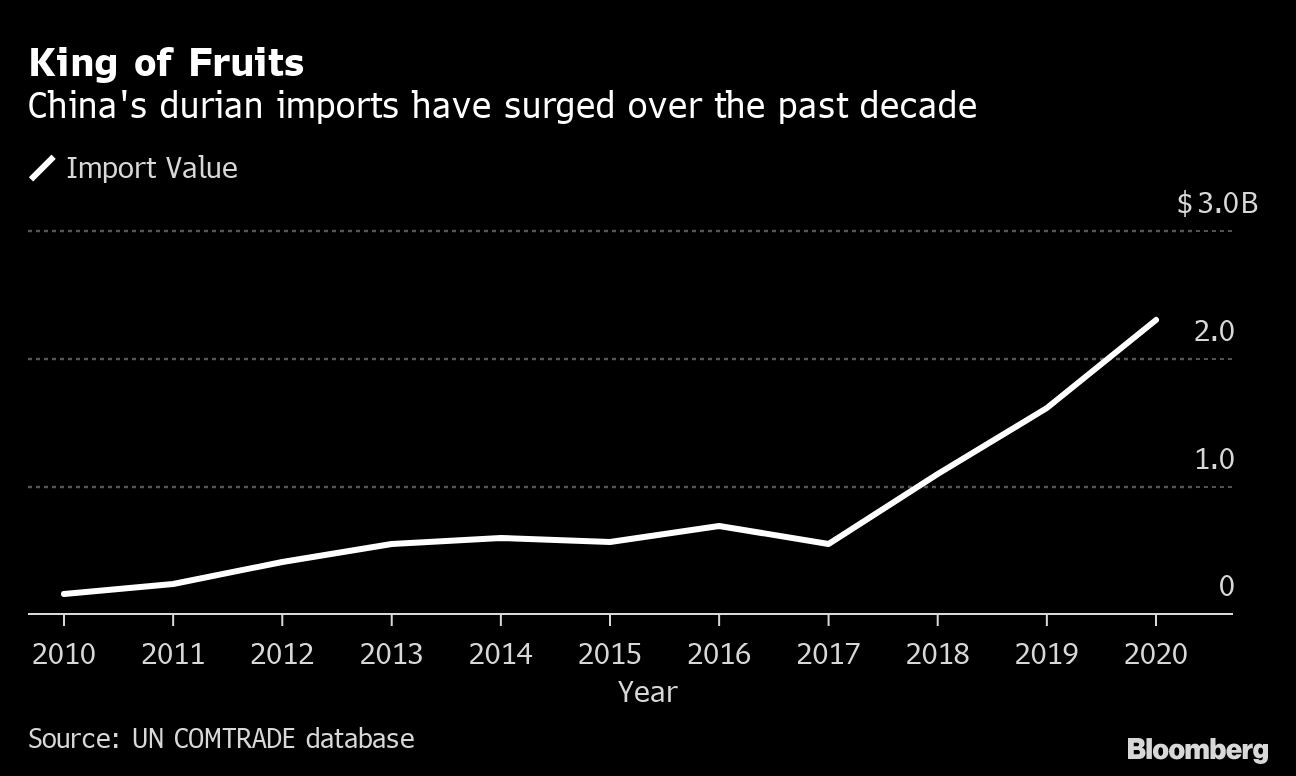 With its creamy custard-like flesh and powerful odor, the thorny fruit has surged in popularity in China. Imports of fresh durians quadrupled to $2.3 billion last year from 2017, according to United Nations data, and they overtook cherries to become the country’s No. 1 fruit import by value in 2019.