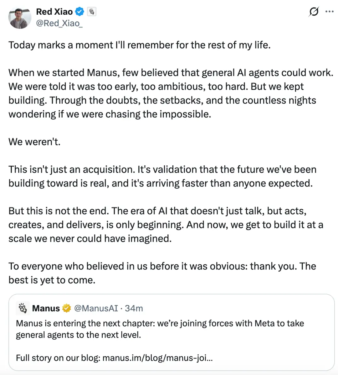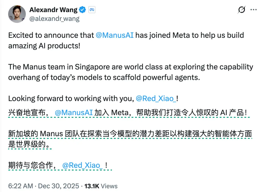 Meta的AI话事人亚历山大王已经在X上发布了对Manus团队和创始成员之一肖弘的欢迎贴,不知道等团队开始一起工作过后,两人将是什么样的汇报线关系。收购完成后,Manus创始人肖弘将出任Meta副总裁。
