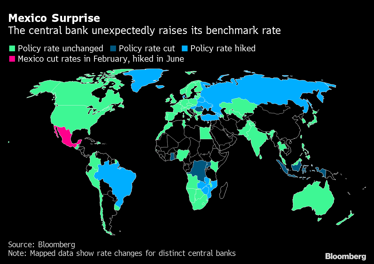 Mexico’s central bank wrong-footed economists and boosted the peso by unexpectedly increasing borrowing costs for the first time since late 2018, after inflation remained way above target.