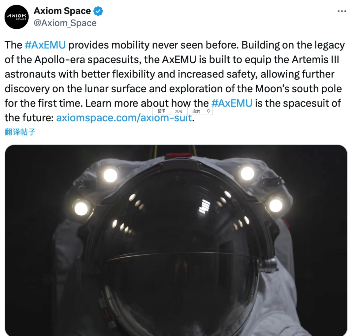 该款宇航服还具备抵御月球南极极端温度的能力,并且能提供更好的月尘防护。
