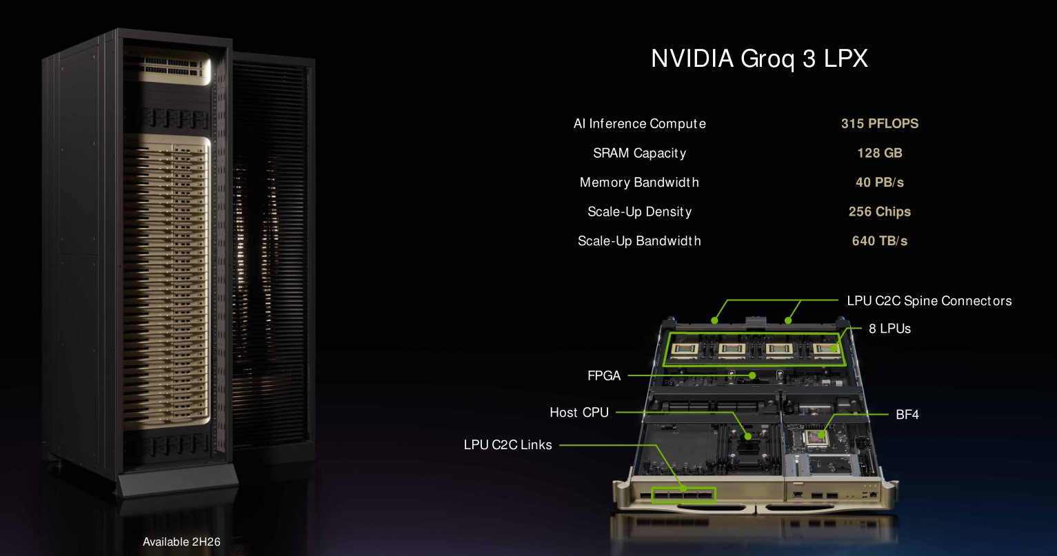 Groq 3 LPU芯片会以Groq 3 LPX机架的形式出现,可集成256个LPU30芯片,缓存容量达到了128GB,内存总带宽则提升到了40PB/s,互联带宽也有640TB/s。