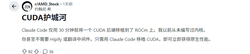 “CUDA花了20年时间构筑起这道护城河,可能在6个月内消失。”johnnytshi说。