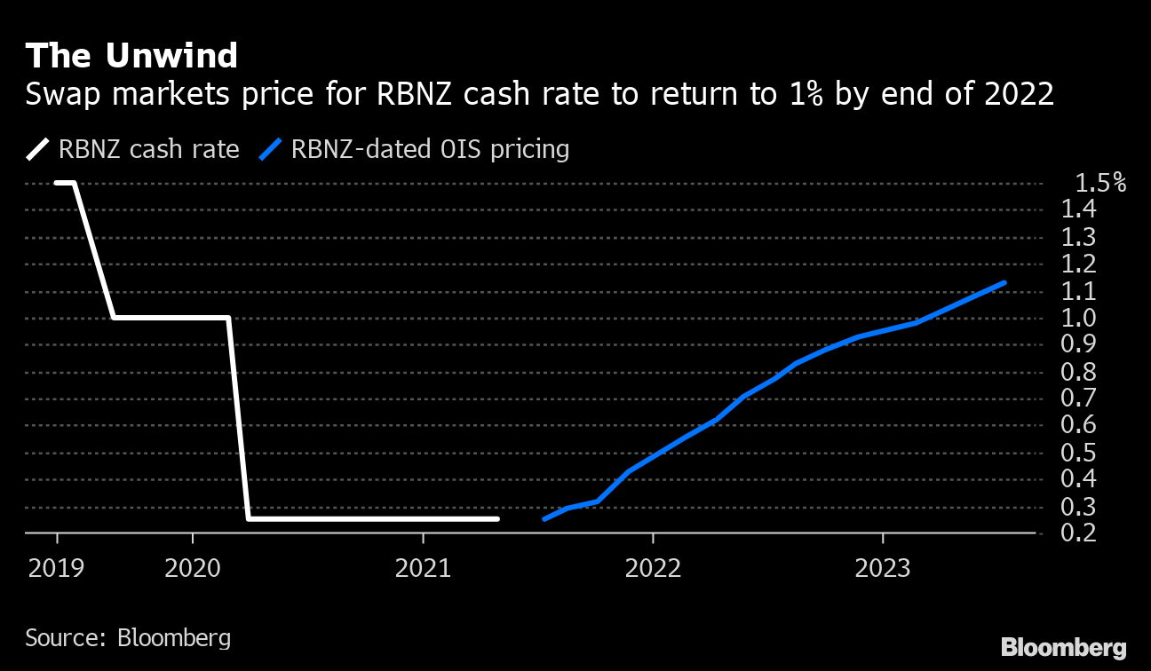 Swap markets are priced for the Reserve Bank of New Zealand to hike rates to 1% by the end of 2022, which would erase the 75 basis point cut in response to the pandemic from March 2020. The benchmark 10-year bond gained five basis points.