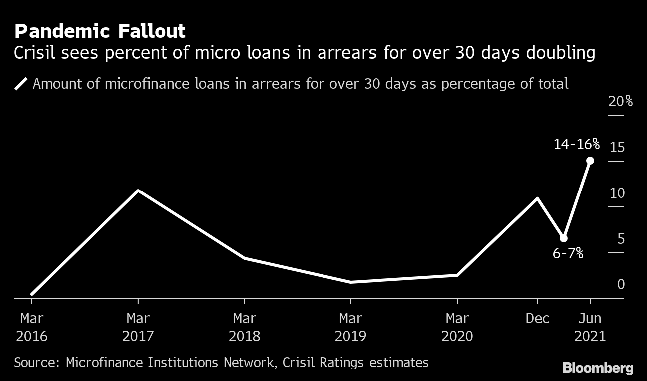 • The amount of Indian microfinance loans in arrears for over 30 days could more than double to 14%-16% of the total in June from 6%-7% in March due to the fallout from the second coronavirus wave, Crisil Ratings wrote in a note