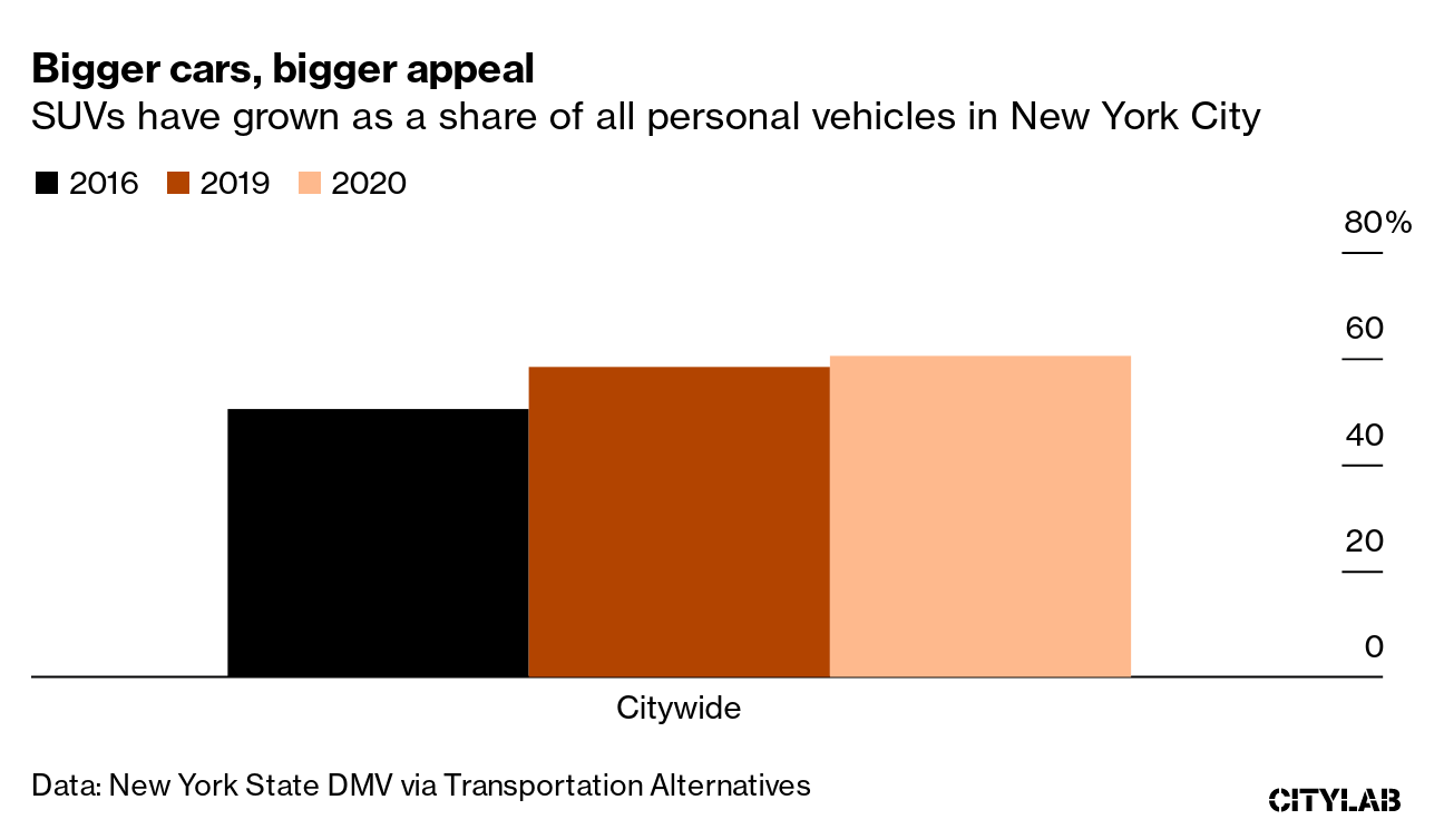 SUVs and pickup trucks are an enduring American obsession. Ford’s F-150 pickup has been the most popular vehicle sold in the U.S. since 1981, and SUV sales likely surpassed 50% market share last year. They draw buyers even in the densely packed streets of places like New York City: SUVs have grown nearly 10% as a share of all personal vehicles in the city since 2016, according to DMV data provided by the advocacy group Transportation Alternatives.