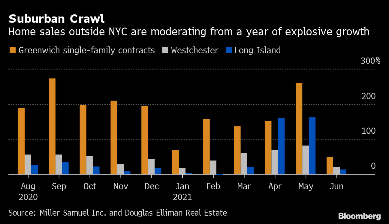 Westchester County saw 20% more contracts last month than in June 2020. But in May, the annual increase was 81%. In Greenwich, Connecticut, June’s 50% jump in contracts was the smallest year-over-year gain in data going back to last July.