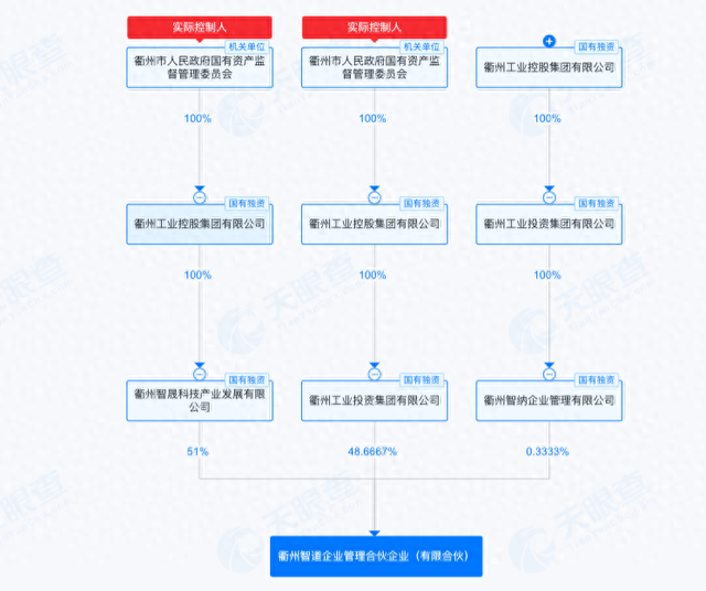 天眼查显示,衢州智道企业管理合伙企业(有限合伙)由地方国资衢州工业控股集团有限公司(以下简称“衢州工控”)通过衢州智晟科技产业发展有限公司、衢州工业投资集团有限公司和衢州智纳企业管理有限公司控股,背后实际控制人为衢州市国资委。