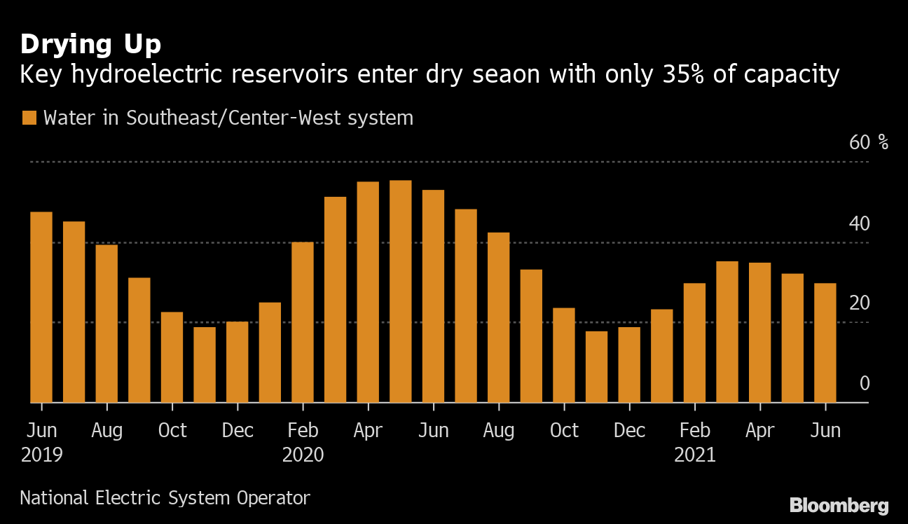 Rainfall in Brazil this year has been the scarcest since data started being recorded in 1931. Water reservoirs in the country’s southeast and center-west regions, where its largest hydropower plants are located, have entered the dry season in March with only 35% of their capacity. When rains hopefully resume in November, they may be running at little more than 7%, according to government estimates.