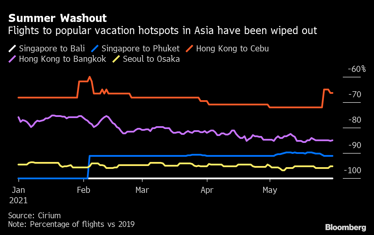 While Hong Kong has brought new cases down to practically zero, its draconian quarantine regime makes travel unappealing for the masses. A plan for quarantine-free travel with Singapore was shelved after an outbreak there. Malaysia went into a two-week lockdown from June 1 following a jump in infections. Low vaccination rates haven’t helped get things moving.