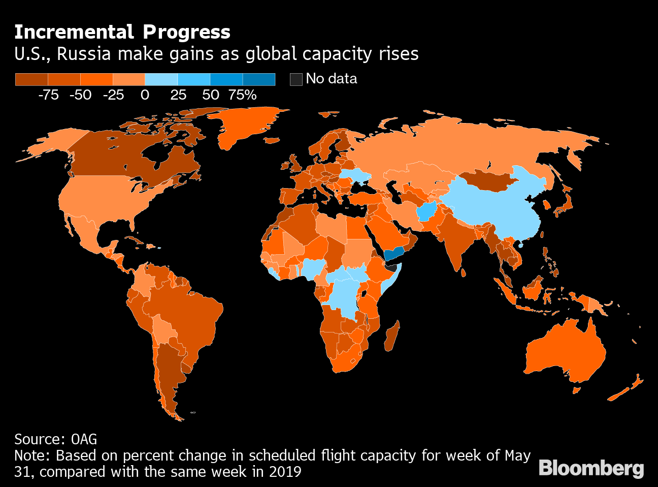 Some markets even managed to claw back modest gains: Capacity in Russia has almost returned to 2019 levels, while Nigeria is up 7.3% from that year. The U.S. recovery picked up speed -- it’s now down 23% from 2019 levels.