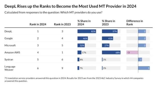 一项针对28个国家或地区127家语言公司的调查就显示,82%全球领先语言服务公司都在使用DeepL机翻服务,谷歌翻译占46%,微软有32%,亚马逊17%。