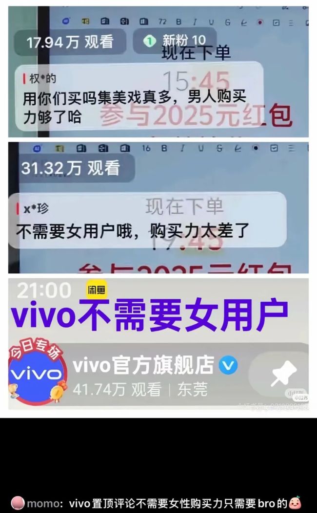 先给没吃瓜的朋友补个课。11 月 29 号晚上,有网友晒出 vivo 官方直播间的截图,说主播把“不需要女用户,购买力太差”“男人购买力够了,集美戏真多”这种刺眼的评论置顶了。
