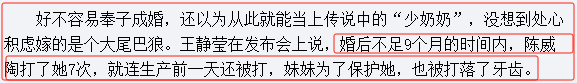事后,或许是为了扩大影响力,王静莹接受记者采访时,更谈论陈富豪婚前就偶尔会动手,但打得不狠,结婚后,她怀孕期间因拌嘴也被暴揍,甚至生产前一天,还被狂打。