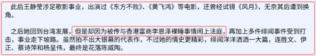 但没多久,王静莹又被曝光攀上香港富商李恩泽,两人情到浓处还搞起了裸睡,一度闹上了法庭。