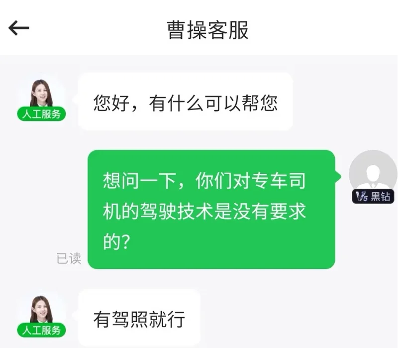 然而,有用户曾在对专车司机的驾驶技术不太满意时,咨询了曹操出行的客服并询问“对专车司机的驾驶技术是没有要求的?”客服表示,“有驾照就行”。