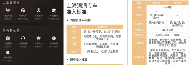 至于滴滴专车,以其在上海的准入标准为例,不仅对驾驶员的仪容和账号提出了要求,也强调了车辆的车容车况:车内外干净整洁,车外观无划痕,无碰撞痕迹;真皮座椅无褶皱、无破损、无座椅套等私人物品……