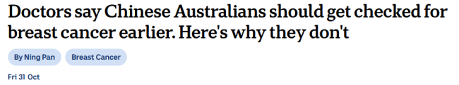 澳洲肿瘤医生Stephen Birrell表示,华裔女性往往会比其他澳洲人更早罹患乳腺癌。