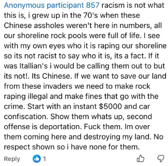 但最近网上传播的赶海很多都跟华人群体联系起来,有人质疑是否在给群体贴负面标签。在Facebook群组里有居民分享自己在Milford制止赶海人的经过,并且贴上了对方的照片。