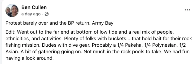 04一场种族争议爆发周六抗议结束后,一位当地居民发帖说,Army Bay赶海的人里其实“什么种族都有”。“这群人有各种族裔,很多人提着桶,但桶里装的是用来钓岩礁鱼的鱼饵。据我观察1/4白人,1/4岛裔,1/2亚裔。”