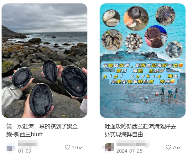 帖子指出,在小红书,赶海被宣传为“来新西兰必做的事情”。“很多人都宣传‘天然海鲜自助,不吃白不吃’。“尤其是新西兰的黑金鲍,在海外价格昂贵,每天都有大量人去海边捕捞。”