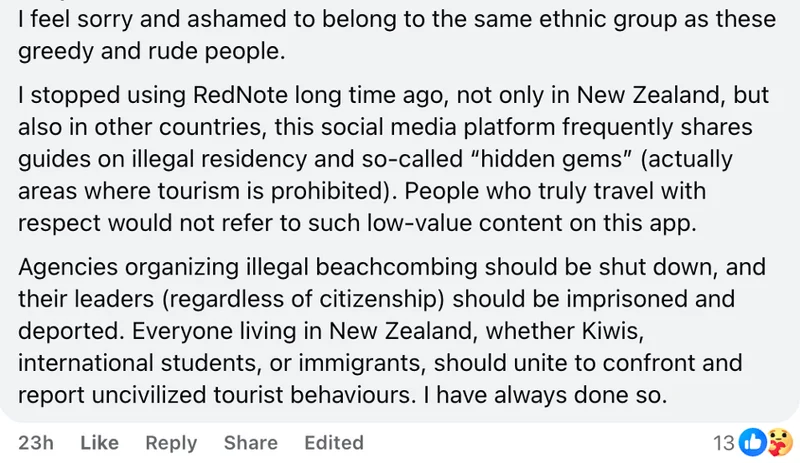 有新西兰华人表示,因为部分贪婪和粗鲁的同胞而感到“羞愧”。“我很久都不用小红书了,上面有很多人分享一些并非合法的信息比如把禁止去的地方称为‘隐藏宝藏’,有素质的旅客是不会分享这样的信息的。“那些非法组团赶海的机构应该被关闭,组织人应该坐牢或者遣返。”