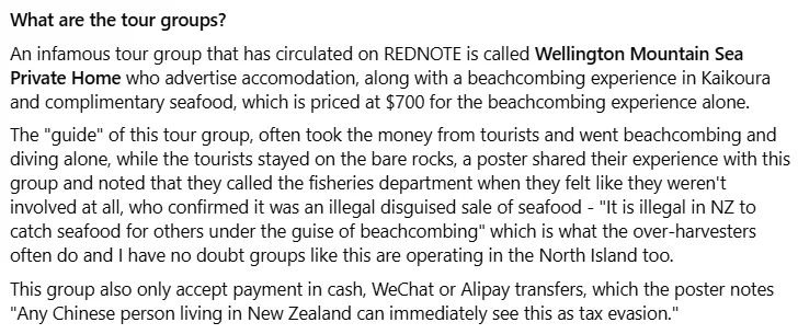 小红书上一个账号被点名,以“住宿+赶海+海鲜”为卖点,仅赶海体验就收费700纽币。