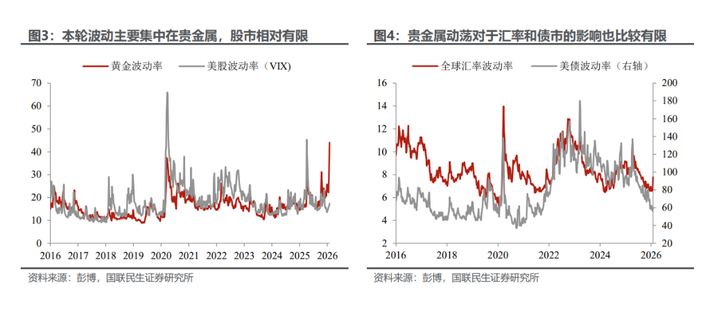 第二是市场的波动有较为明显的局部性。与之前的市场大波动不同,金银的“历史性”波动并没有扩散,主要的股债汇市场波动虽然有所提高,但极为有限。