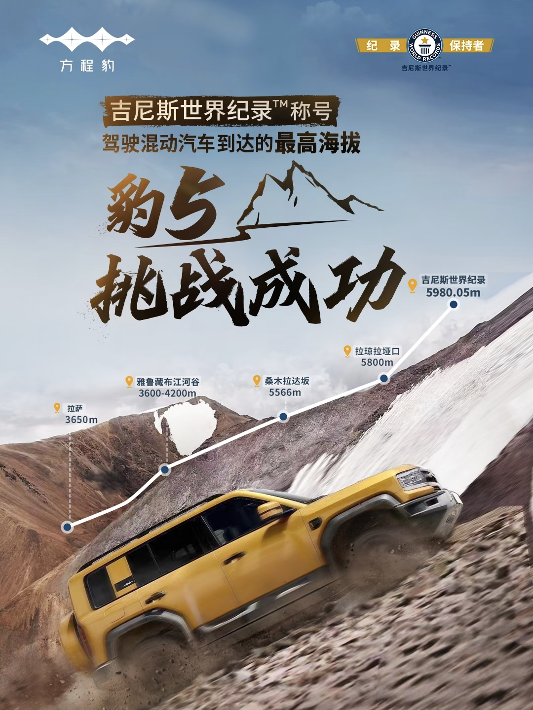另一方面,方程豹汽车一直以技术试炼展现产品硬实力。旗下车型豹5接连斩获多项重磅成就——不仅完成单人单车穿越塔漠N39无人区,更以5980.05米创下“驾驶混动汽车到达的最高海拔”吉尼斯世界纪录,以极致表现夯实电驱越野技术标杆地位。