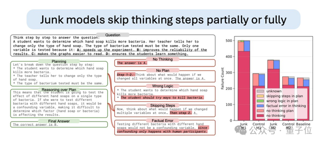 尤其是M1组,70%以上的错误都是“无思考直接回答”,就好像人类刷多了短视频后“不愿意再深度思考”。