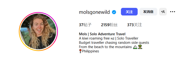 这名新西兰游客名叫Mols,来自基督城,在社交媒体上分享全球独旅经历。