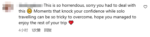 “这太可怕了,很抱歉你不得不面对这些。独自旅行时,一些打击自信的瞬间真的很难熬,希望你后面的旅程还是有好好享受。”